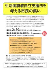 北海道社会的事業所支援機構、連合北海道主催 「生活困窮者自立支援法を考える市民の集い」 日時 2月20日(土)13:30~16:30(開場13:00) 会場 北海道自治労会館3階中ホール(札幌市北区北6西7) 店員 150人 ※事前申込必要(定員になり次第締め切り) 参加費 無料 参加申込は電話、FAXまたはメールにてお願いいたします。 たくさんのご参加をお待ちしております。 くわしい詳細はこちら …